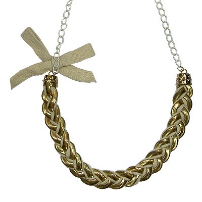 Over cotton tank or a Sunday dress, this necklace will surely add cachet to your look. Canvas and metallic gold 'strings' intersperse in rope-like fashion and terminated by a knotted 'shoe lace'. Feminine Frump is worn long via an ivory color coated metal chain link and can transform any of your ensemble in high style.