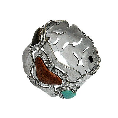 Picture a tribal heroine rising above the Earth to protect their village harvest, a new mythological goddess is born! This handmade metal bangle encrusted with assorted exotic tropical hard wood, turquoise and Mother of Pearl will surely rejuvenate the Goddess in you.